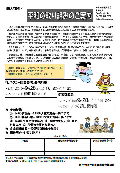 また9月26日が国連核廃絶デーと位置づけされています。それに合わせ、わかやま市民生協労働組合も9月~10月を平和活動の強化月間と位置づけ、さまざまな平和活動へと取り組んでいこうと考えております。